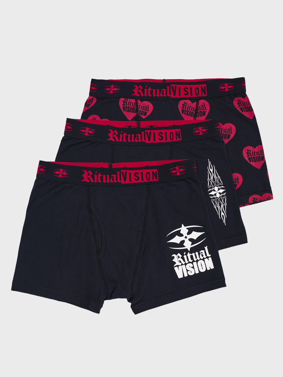 The Core Boxer Brief 3 Pack in Black delivers three individual art pieces across the boxers. 140GSM 100% cotton jersey with Jacquard woven elastic logo waistband. Ritual brings the boxer pack every cult member needs this summer.
