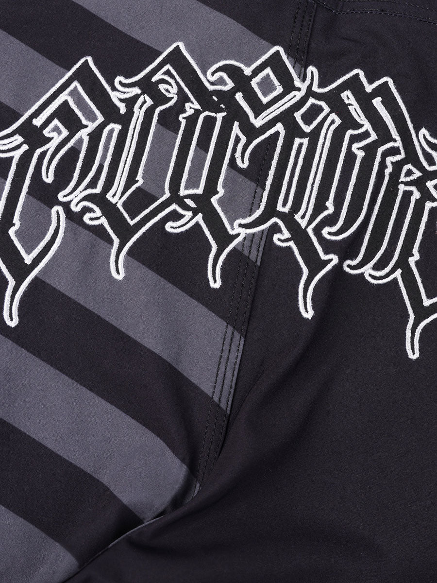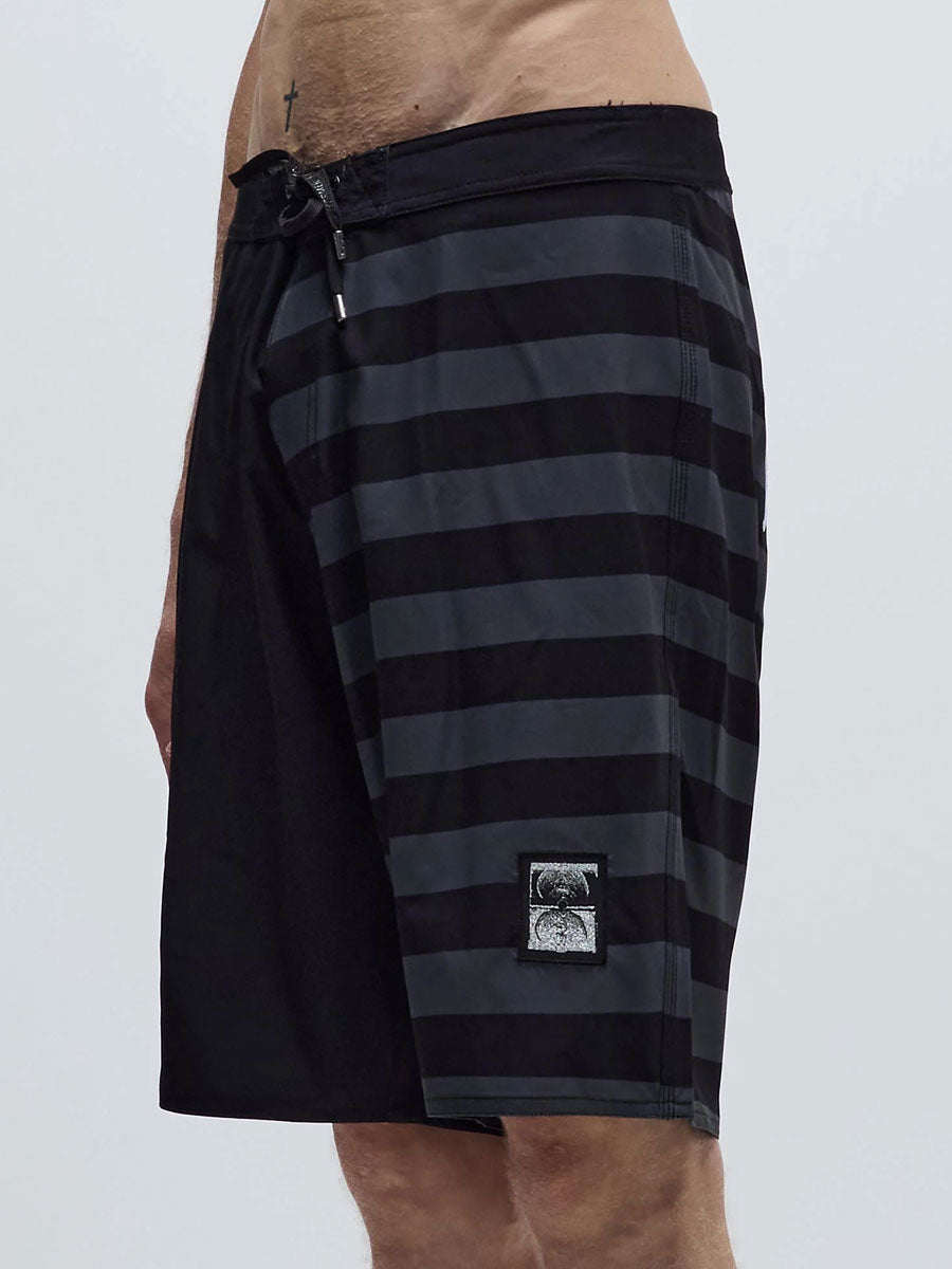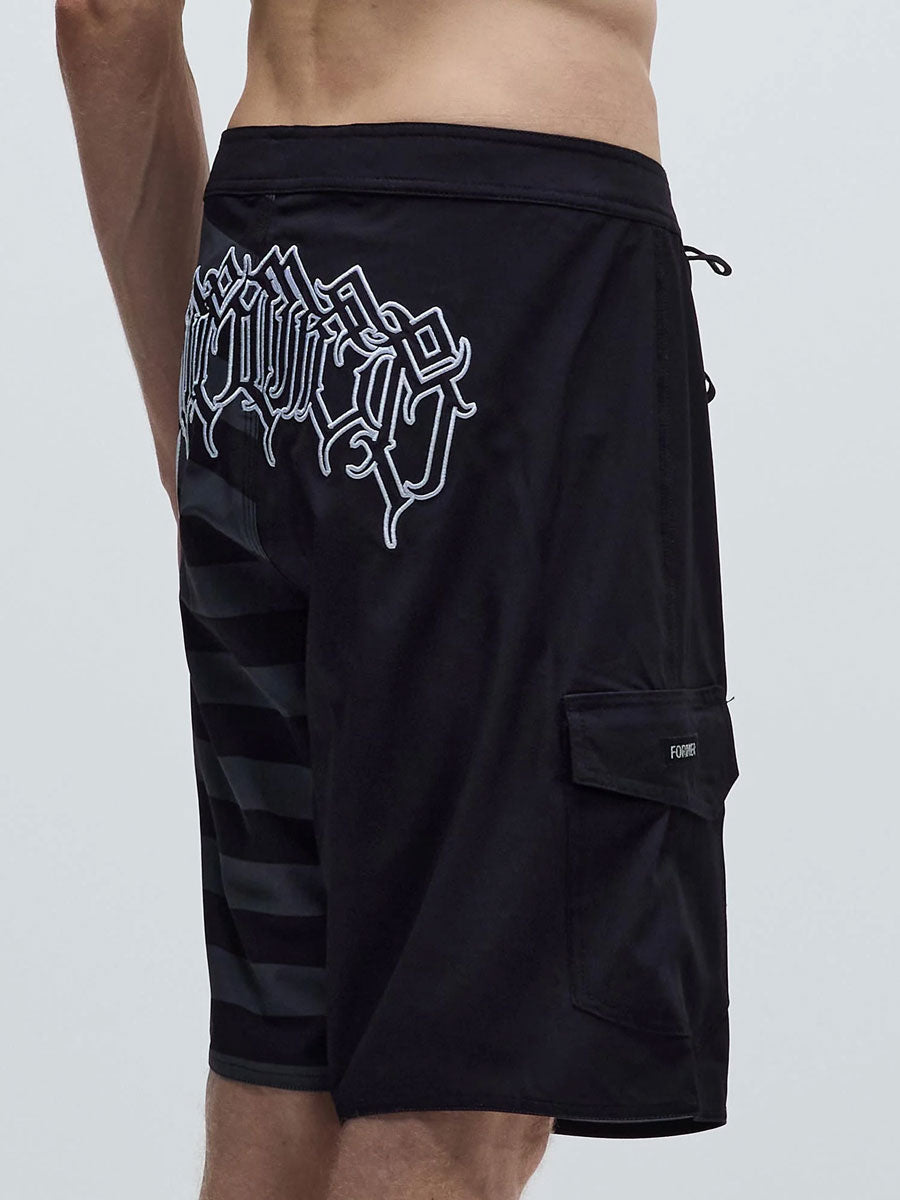 Designed by FORMER team rider Dion Agius and constructed from a premium 4-way stretch fabric. Delivered in our Standard 20" trunk fit featuring sublimated stripe prints, back applique artwork, silver Lurex Crux and Legacy woven labels, and a side cargo pocket.