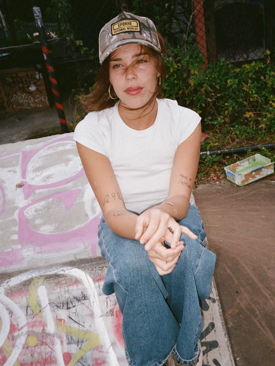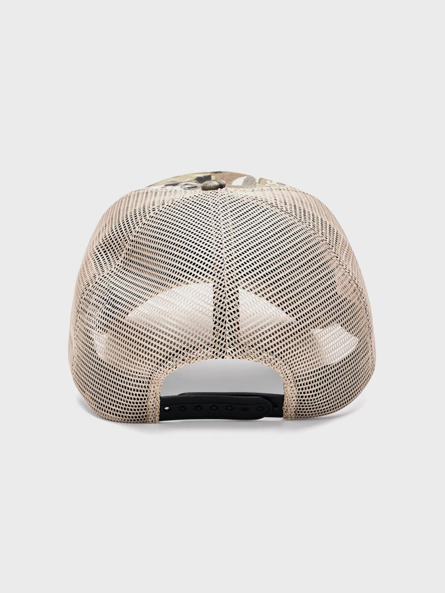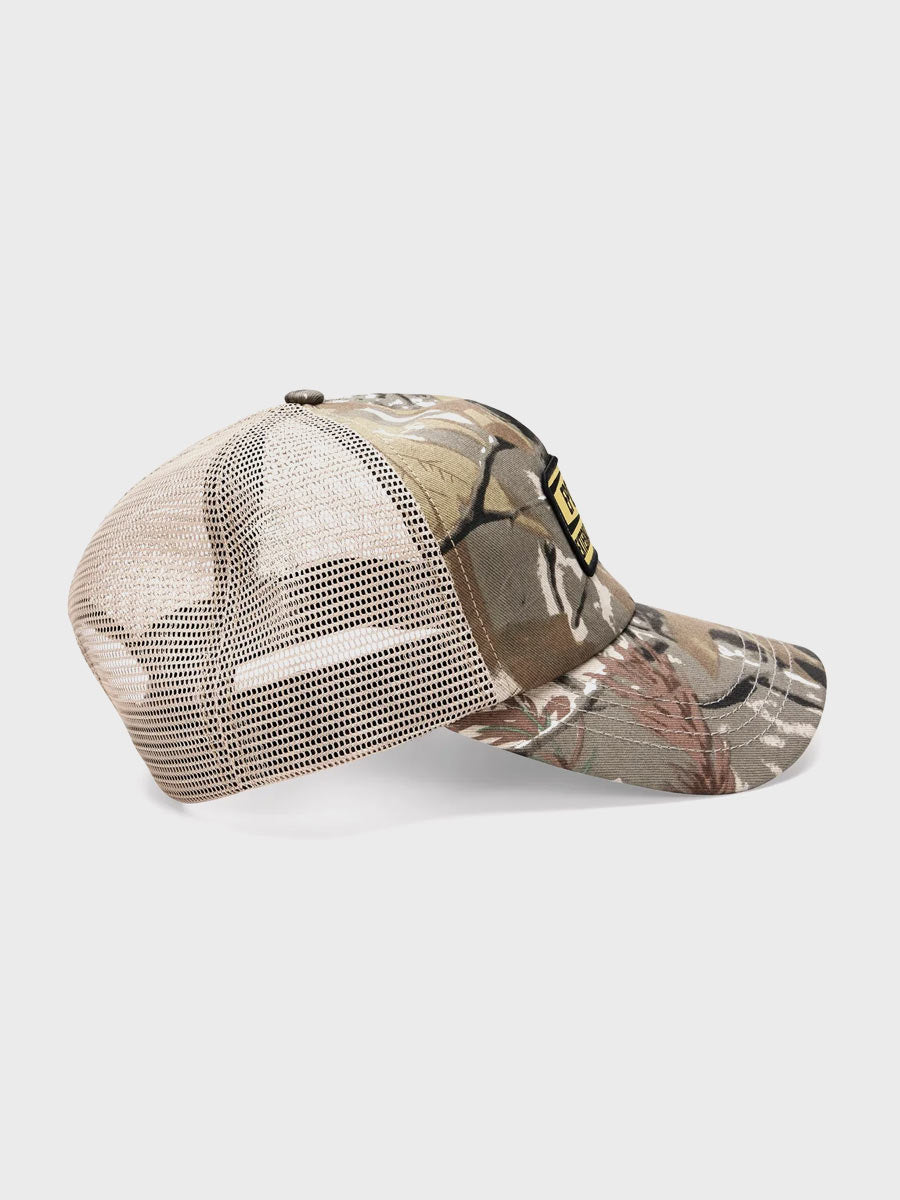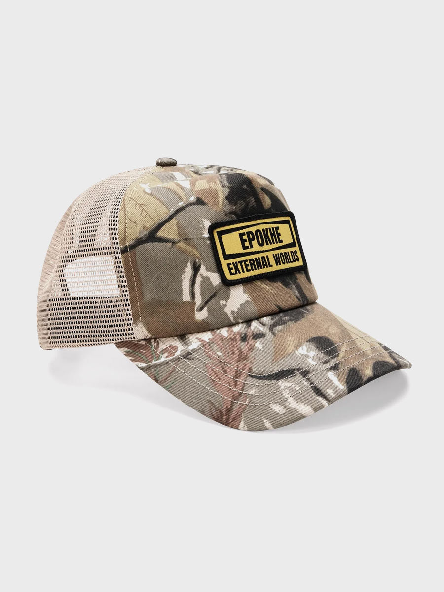 The Driver Cap in Washed Green Real Tree brings the trucker into Epokhe’s world. A cotton–poly twill front with mesh back, snapback closure, and washed finish for a vintage edge.
