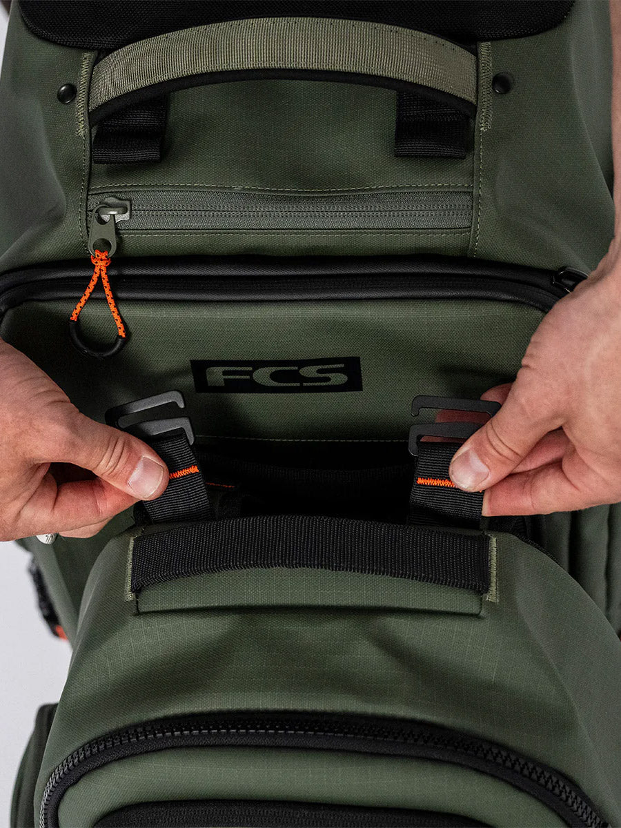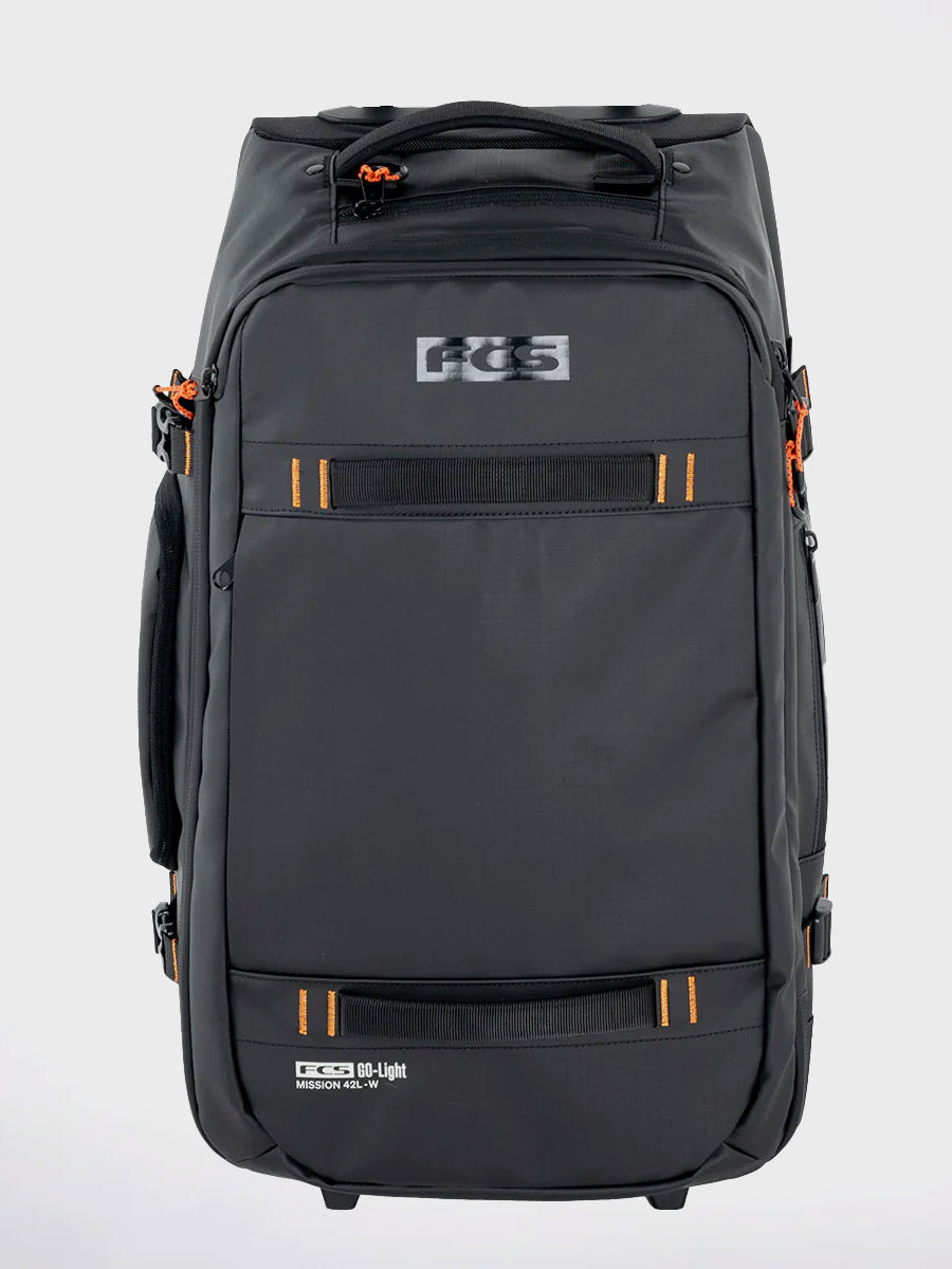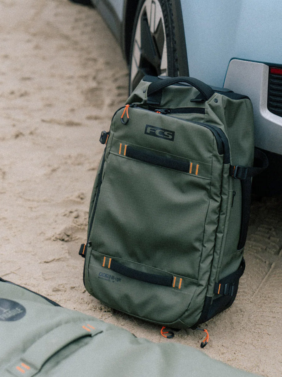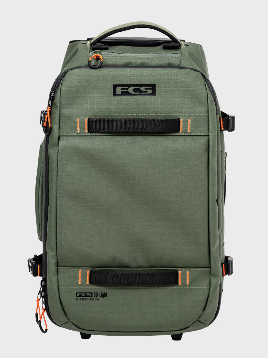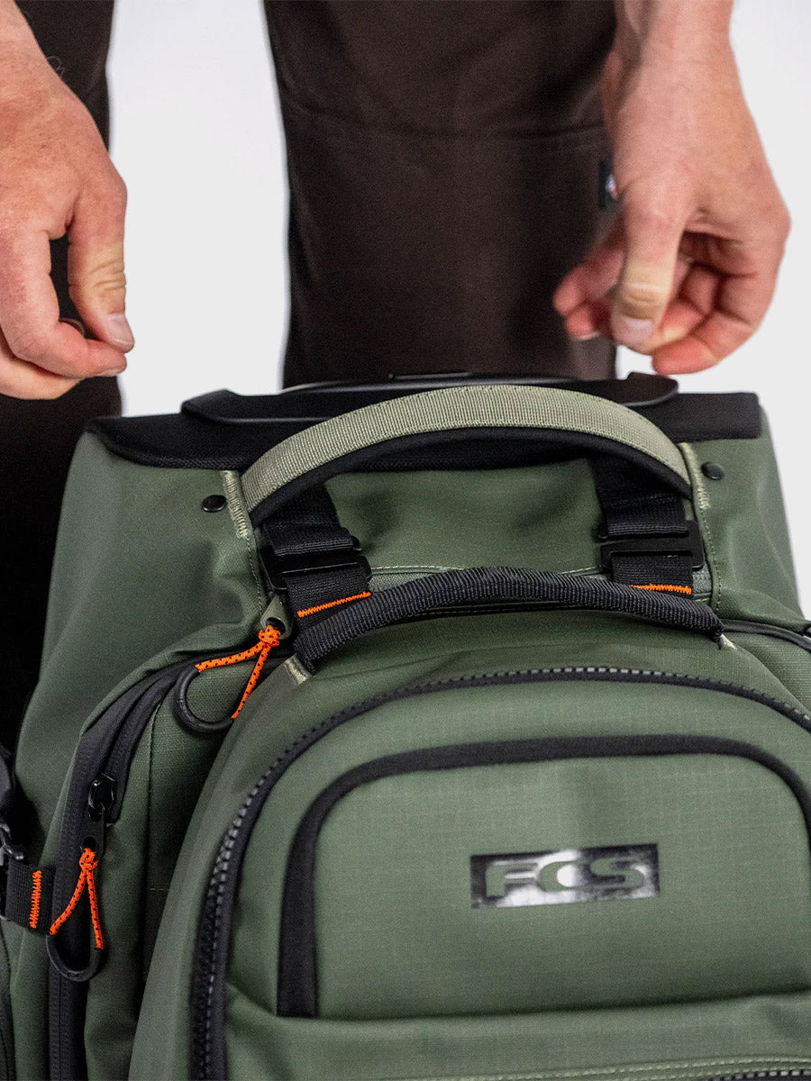 The Mission 42L Wheely bag is an essential piece of the ModuLink System, allowing you to attach any FCS GO-Light Travel Wheelie Board Cover and trolley your bag and board in one single unit.