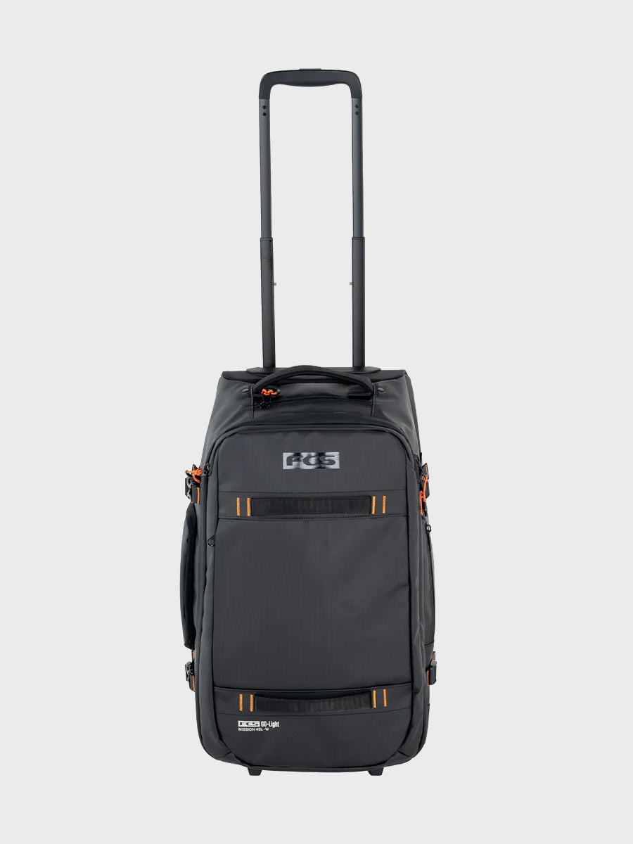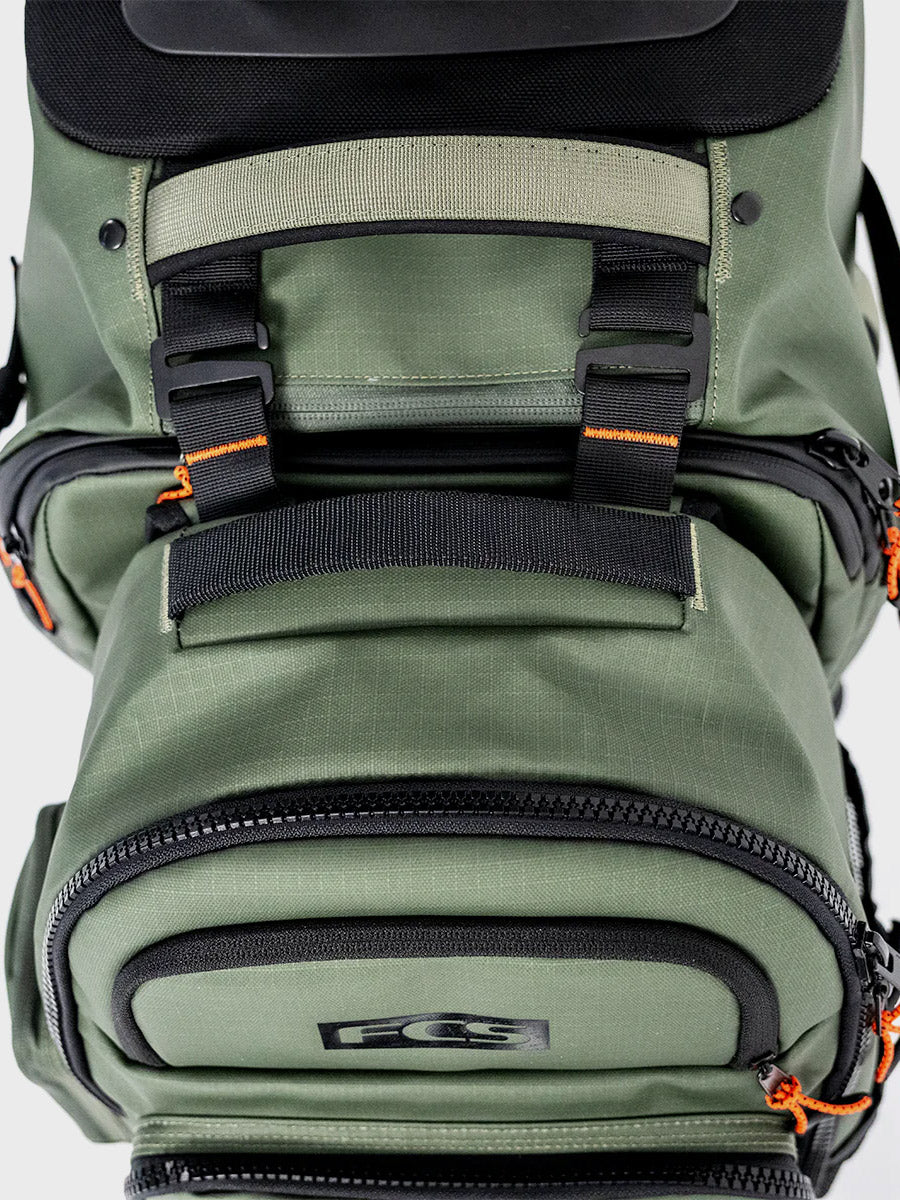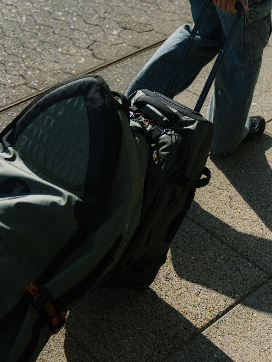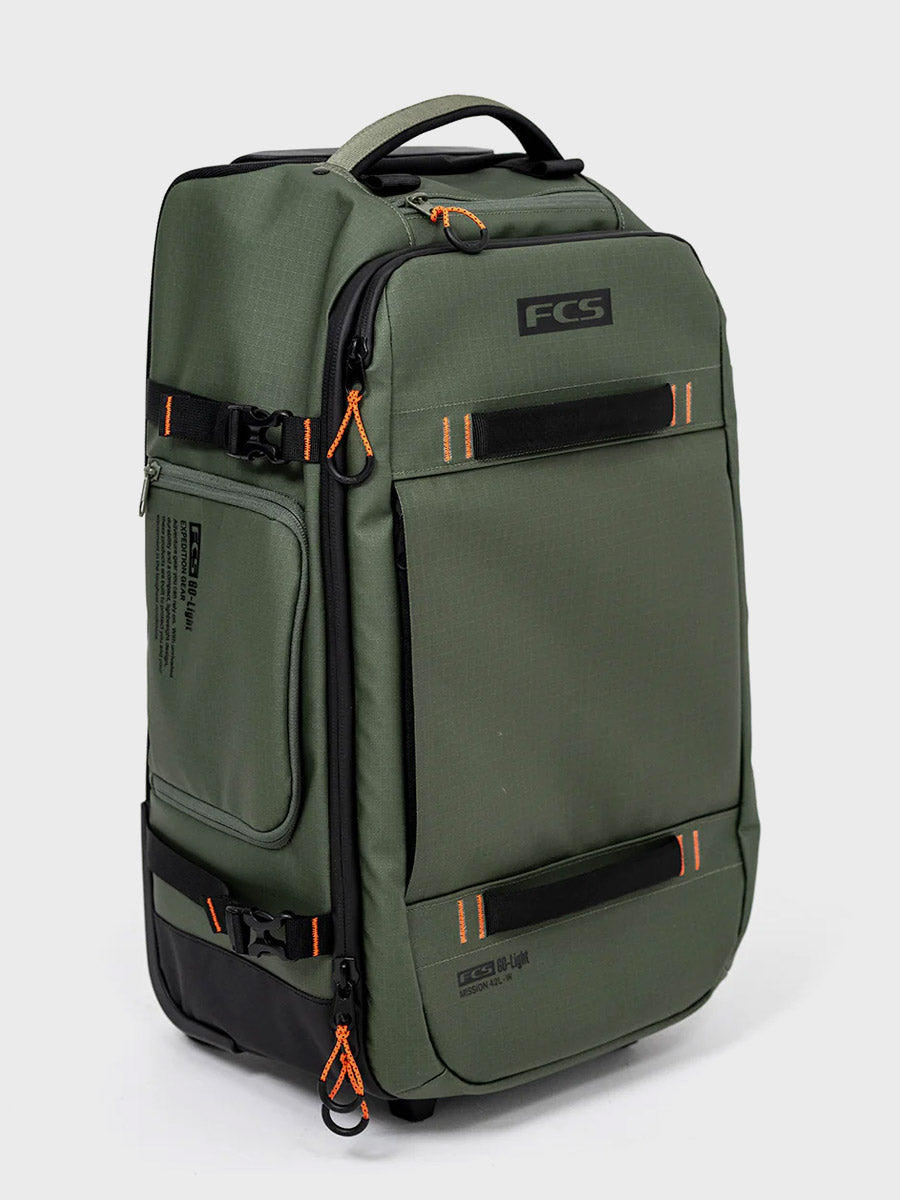 The Mission 42L Wheely bag is an essential piece of the ModuLink System, allowing you to attach any FCS GO-Light Travel Wheelie Board Cover and trolley your bag and board in one single unit.