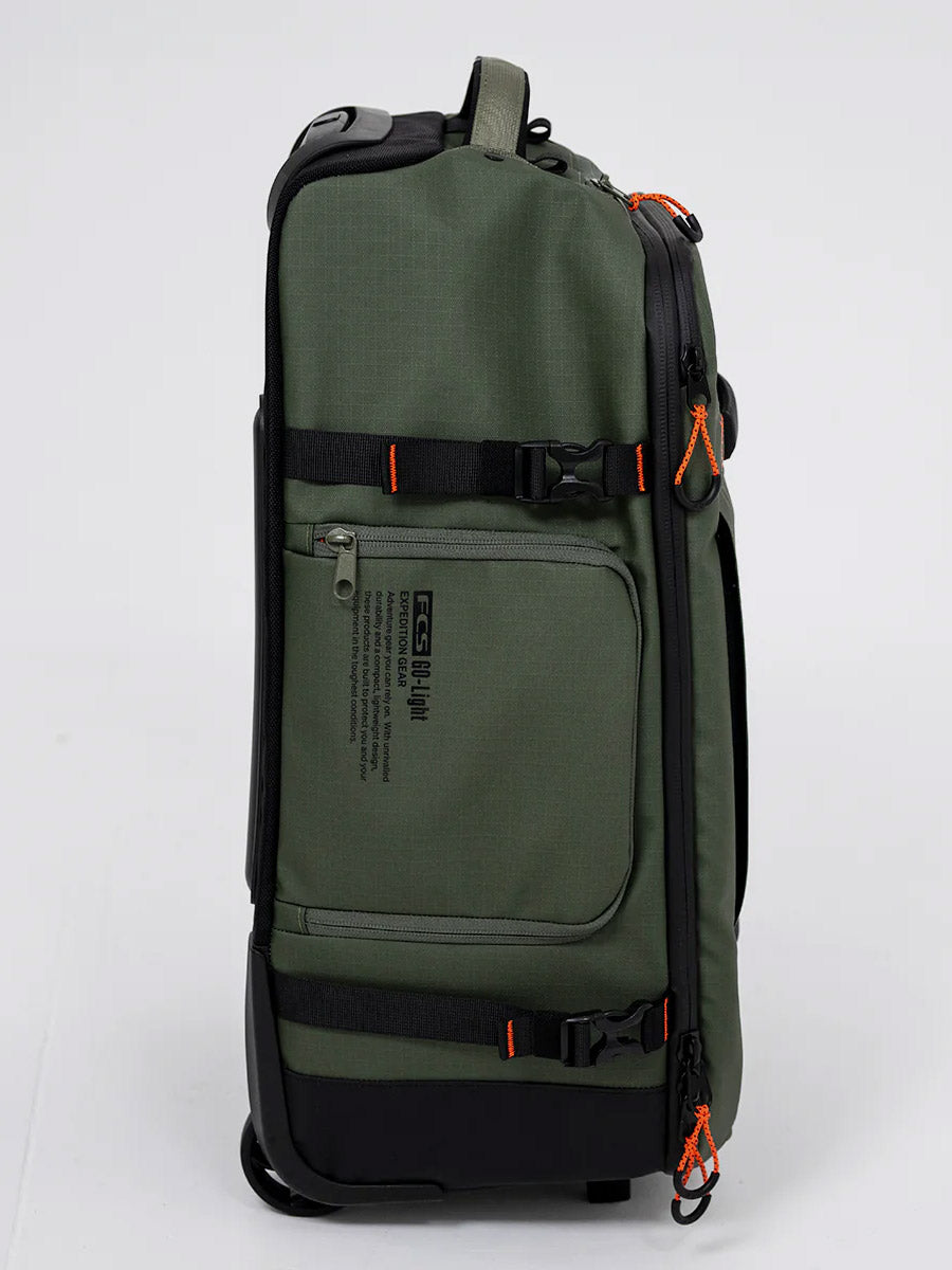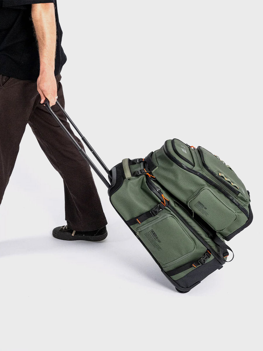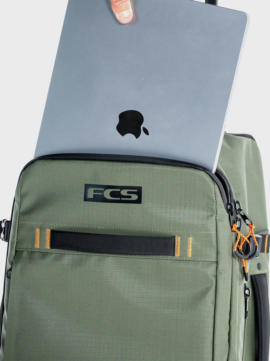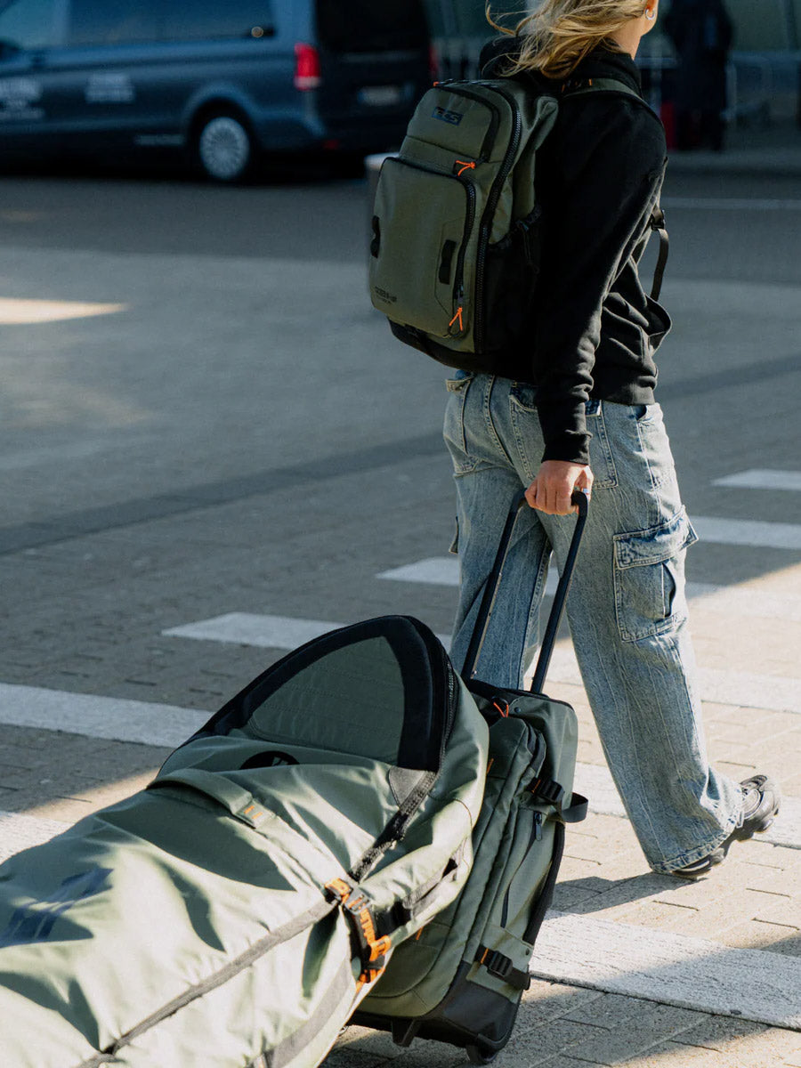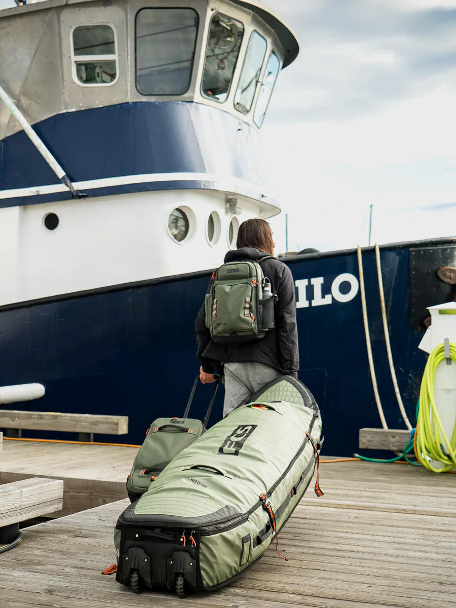 The Mission 42L Wheely bag is an essential piece of the ModuLink System, allowing you to attach any FCS GO-Light Travel Wheelie Board Cover and trolley your bag and board in one single unit.