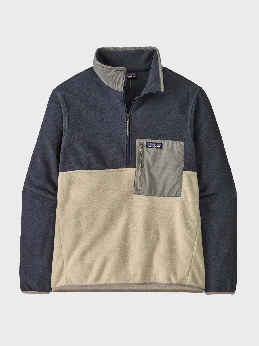 Half-zip fleece pullover with zip-through stand-up collar for warmth; exterior of collar is trimmed with recycled nylon from the Houdini family for added wind protection