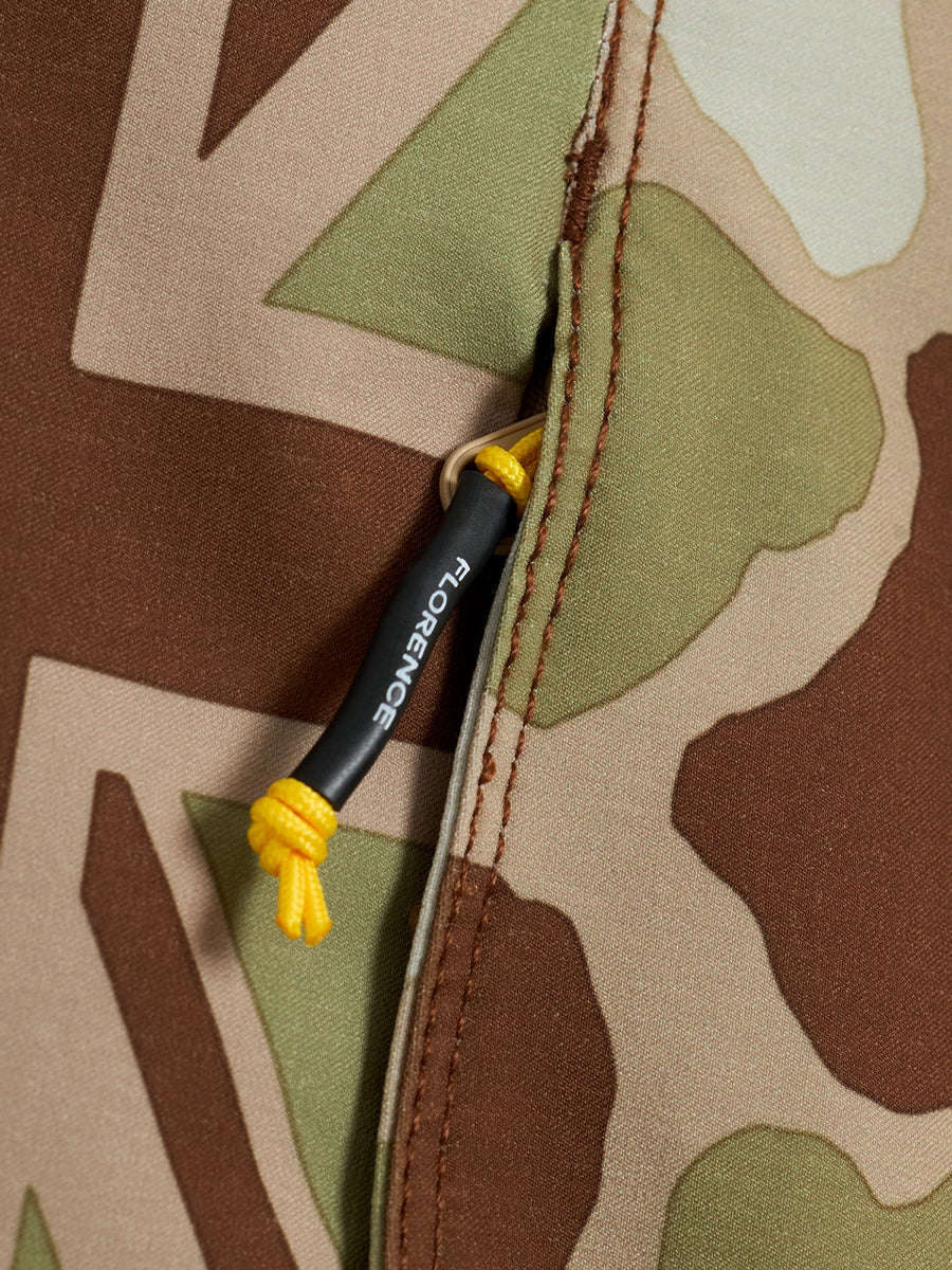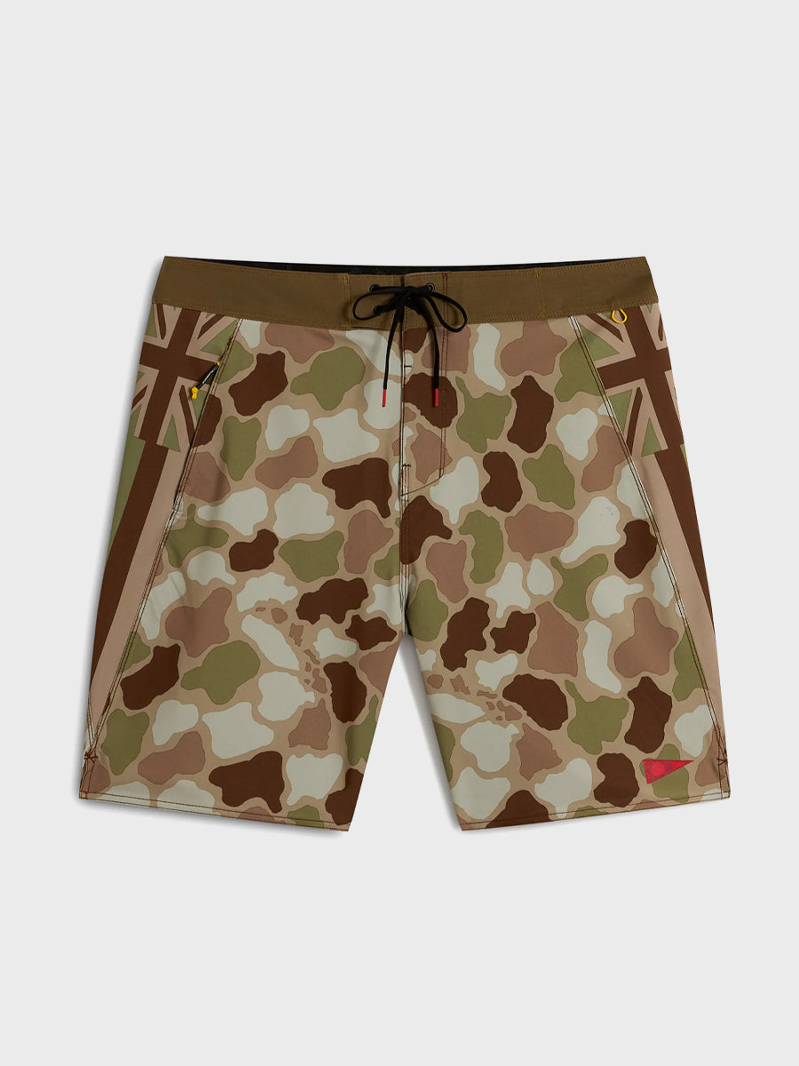 The Florence Marine X F1 Pro Hawaii Camo Boardshort is a durable, 4-way stretch trunk made from quick-drying recycled polyester. On either side, panels showcase the Hawaiian flag in the shape of our sailing burgee emblem, ending at a scalloped hem that improves your range of motion. A stitch-free inseam and smooth cire interior reduces chafe during long periods in the water, while triple-needle stitching adds strength and durability to the design.