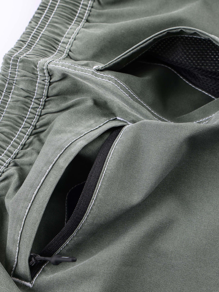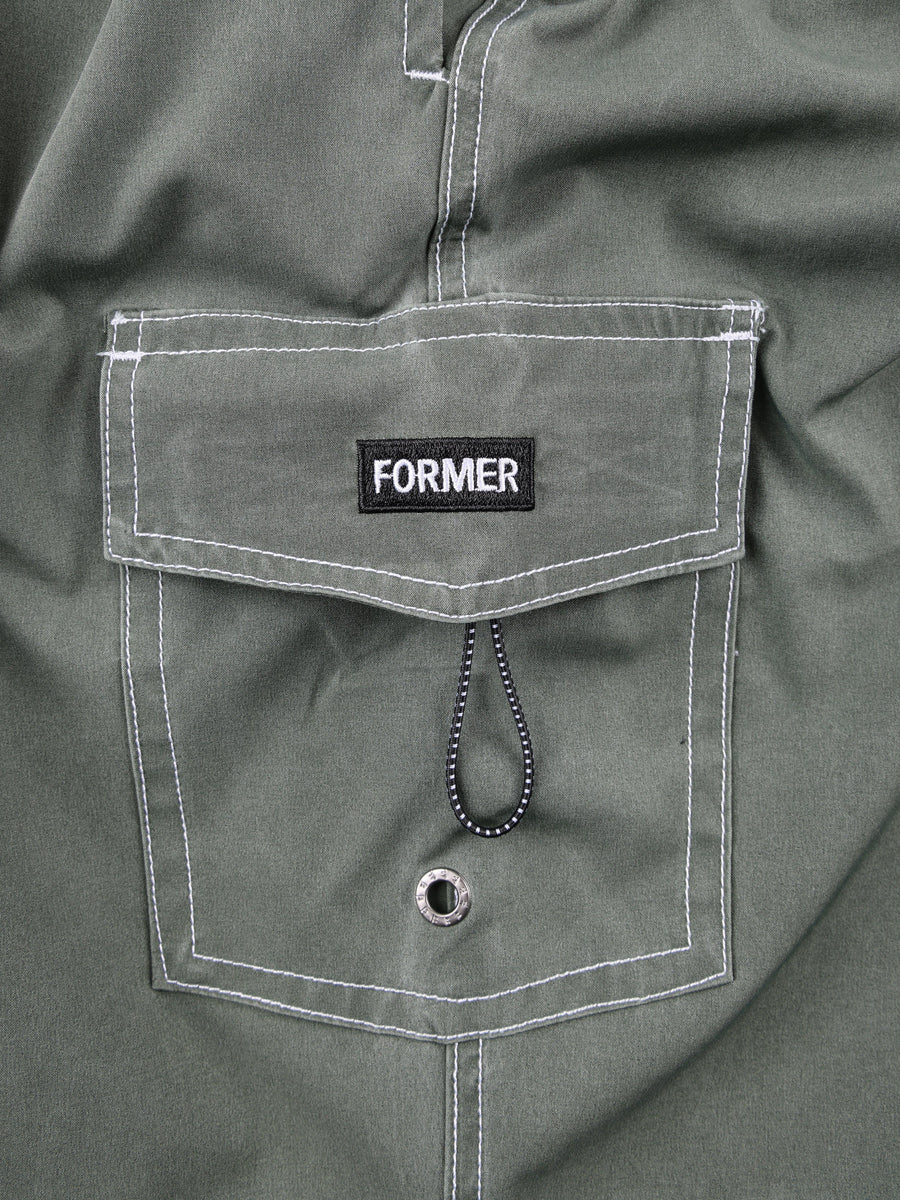 Constructed from 100% polyester micro-fibre. Featuring an elastic waist, ring zip puller back pocket, cargo velcro closure pocket with eyelet, FORMER embroidery on pocket flap, and elastic key loop.