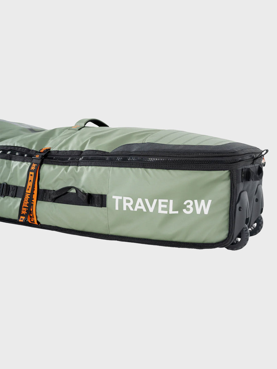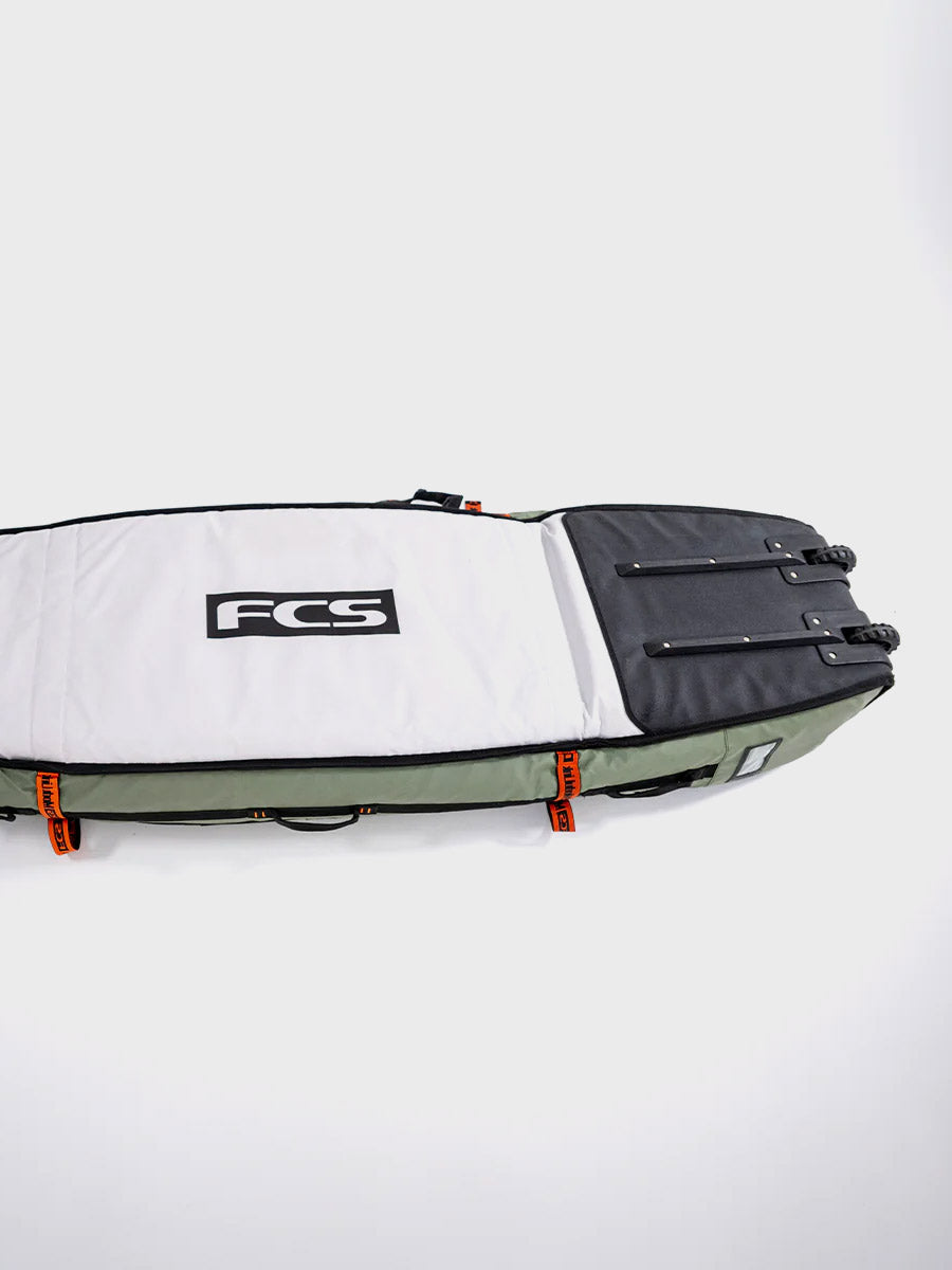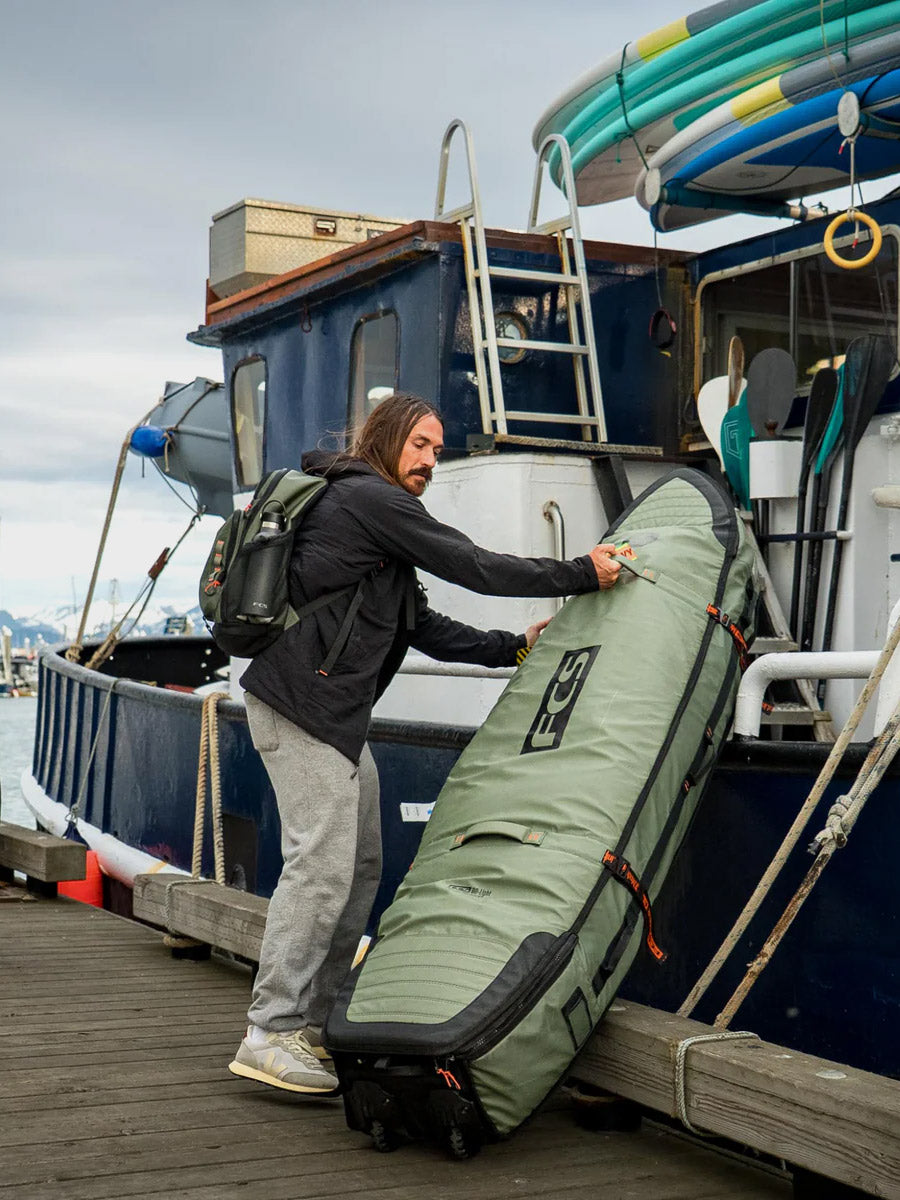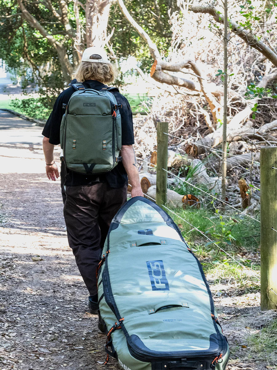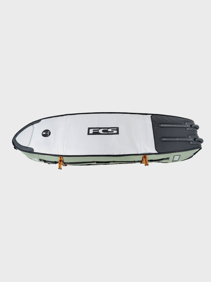 The Travel Wheelie Cover is perfect for international strike missions and surf trips to remote locations. The FCS Travel Wheelie is loaded with features to get your favourite boards safely to the destination with the convenience of built-in wheels to make transit mobility fast and efficient. Designed to withstand the rough treatment through transit, and with the unique ModuLink System to make your life easy on the road.